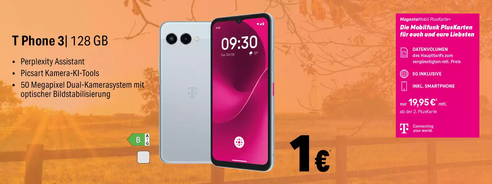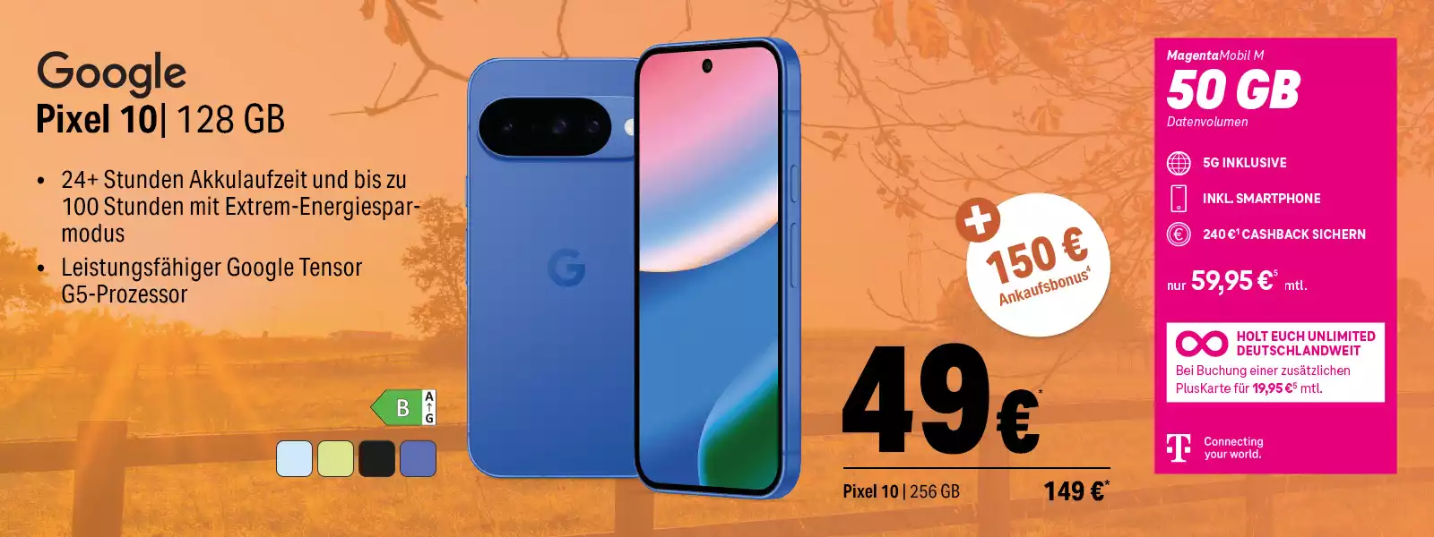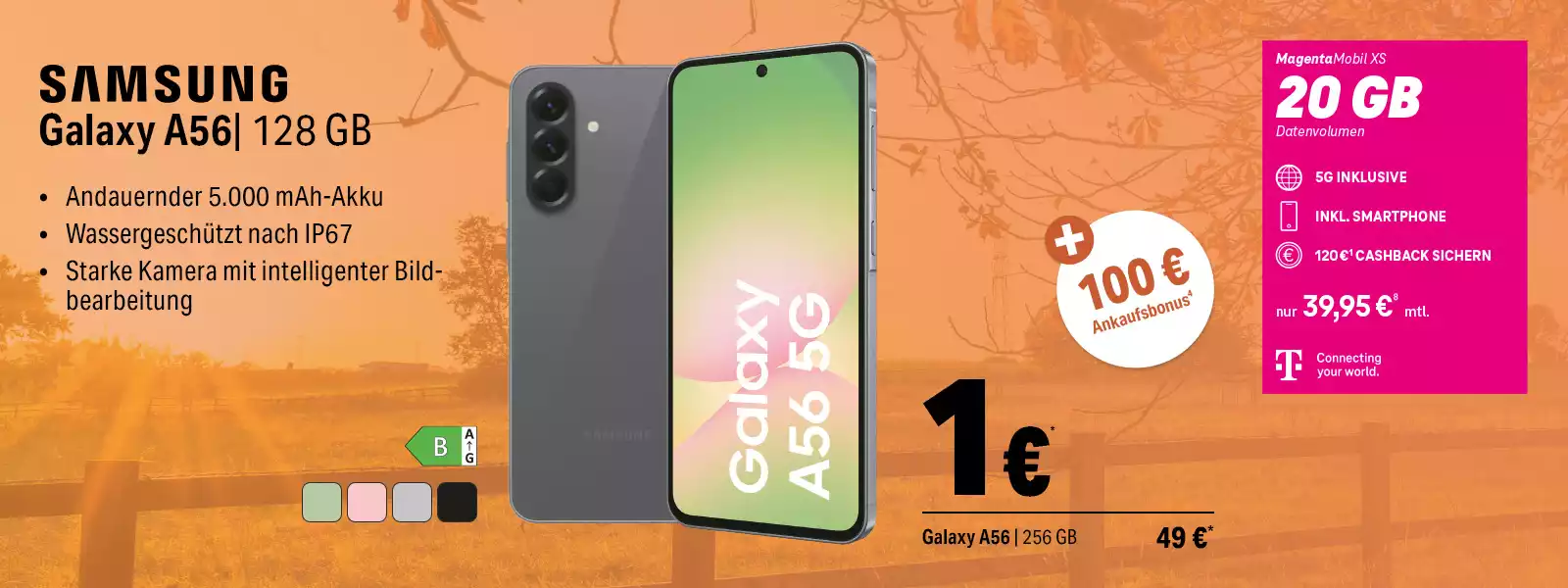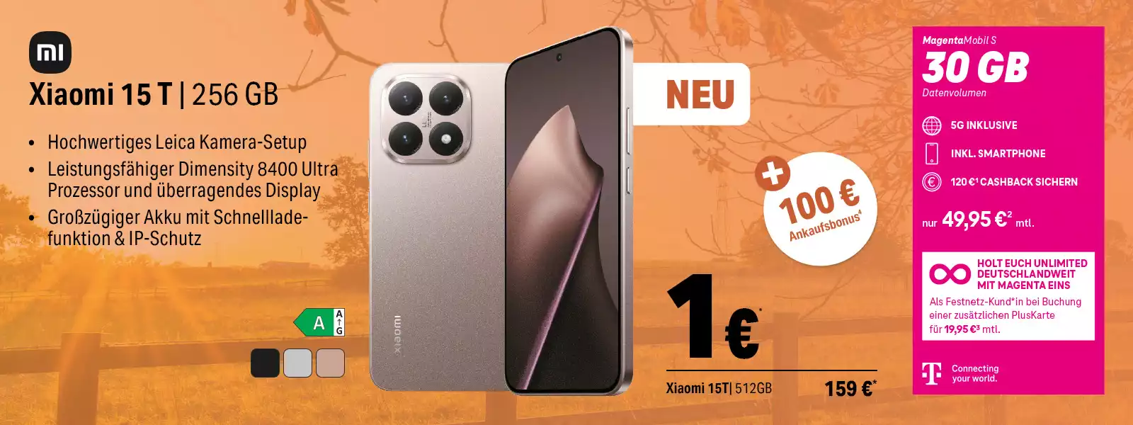 4) Der Ankaufsbonus gilt für private Endkunden ab 18 Jahren bei Kauf eines der Smartphone Modelle Samsung Galaxy A56 oder Google Pixel 10 vom 19.09.2025.-31.12.2025 oder bei einem Xiaomi 15T vom 24.09.–31.12.2025 bei der Telekom Deutschland GmbH (TDG) und bei zusätzlichem Verkauf eines teilnahmeberechtigten Smartphones an die Assurant Deutschland GmbH. Das Handyankaufsangebot für das Altgerät muss bis zum 31.12.2025 generiert werden. Das Altgerät muss bei Kauf eines Xiaomi 15T bis zum 31.12.2025 und bei einem Samsung Galaxy A56 oder Google Pixel 10 bis zum 21.01.2026 bei der Assurant Deutschland GmbH bzw. ihrem Dienstleister eingegangen sein. Teilnehmer erhalten ein Ankaufsangebot für das Altgerät zzgl. eines Ankaufsbonus. 100 € Ankaufsbonus gibt es beim Kauf eines Xiaomi 15T oder eines Samsung Galaxy A56, 150 € Ankaufsbonus beim Kauf eines Google Pixel 10. Das Altgerät muss funktionsfähig sein, d.h. es muss ein- und ausschaltbar sowie entsperrt (kein SIM-/Net-Lock) sein, darf keinen Wasserschaden oder Displaybruch aufweisen und muss einen Mindestankaufswert von 1 € haben. Teilnahme mit max. 3 Aktionsgeräten pro Haushalt. Solange der Vorrat reicht. Die Teilnahmebedingungen befinden sich unter www.telekom.de/handyankauf.