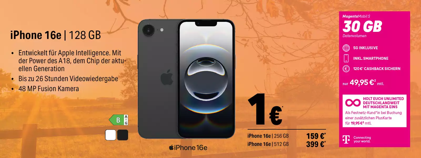 1) Im Aktionszeitraum 01.10.–18.11.2025 erhalten Kunden bei Abschluss eines neuen Mobilfunk-Vertrags mit einer Mindestvertragslaufzeit von 24 Monaten in den Tarifen MagentaMobil XS und S mit oder ohne Endgerät einen Cashback in Höhe von 120 € sowie in den Tarifen MagentaMobil M, L und XL mit oder ohne Endgerät einen Cashback in Höhe von 240 € gutgeschrieben (ausgeschlossen sind PlusKarten Tarife, Young Tarife, Special Tarife, DTAG-Tarife, for Friends Tarife sowie Corporate Benefits Tarife und Datentarife). Einmaliger Bereitstellungspreis jeweils 39,95 €. Die Gutschrift ist nicht mit weiteren Aktionspromotions wie z. B. 6 Monate Grundpreisbefreiung kombinierbar. Zum Erhalt der Gutschrift (nach Ablauf der Widerrufsfrist) ist vom 01.11.2025–31.07.2026 eine Online-Registrierung über die MeinMagenta App (mit Klick auf Ihr Profil, „Cashback einlösen“) unter Vorlage der ersten Rechnung entsprechend den genannten Bedingungen erforderlich.
